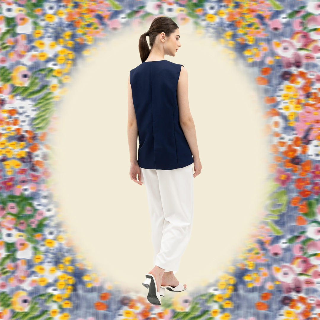 Bloom and Beads Navy vest features a flattering V-neckline and an asymmetric hem with an elongated right side, hand beaded floral appliques at the chest and just above the buttons for a pop of color. Crafted from lightweight fabric, it offers both style and comfort — ideal for layering over shirts or dresses for a bold, modern look.
